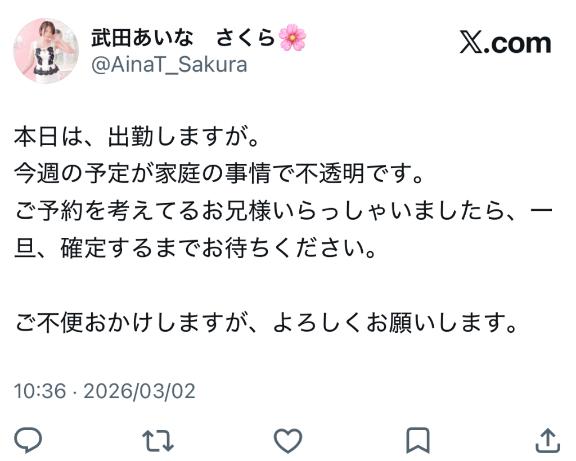 武田あいな お知らせ。 2026年3月2日 10:48 Xでも、ご案内しましたが。今週の予定が家庭の事情により少し不透明になりました。 今週、ご来店の予定で、ご予約を考えているお兄様いらっしゃいましたら。 一旦、予定が決まるまでお待ちください。 本日は、出勤するので、ご予定が合うお兄様は、是非、お誘いお待ちしてます。 武田あいな。